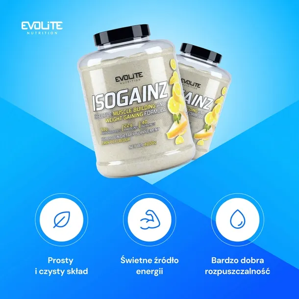 Evolite IsoGainz 4000 g to gainer, który ma za zadanie dostarczyć niezbędnych składników odżywczych do regeneracji i budowy komórek mięśniowych, dzięki czemu może wspomagać wzrost masy. Ze względu na swój skład, gainer często bywa stosowany przez osoby które mają problem z utrzymaniem diety, w której skład wchodzą tylko zwykłe posiłki. Dlatego też Evolite IsoGainz 4000 g może być stosowany jako zamiennik, który pomoże Ci wypracować nadwyżkę kaloryczną. Prosty sposób użycia pozwala na przygotowanie wysokokalorycznego shahe'a w domu lub w pracy i treningu.