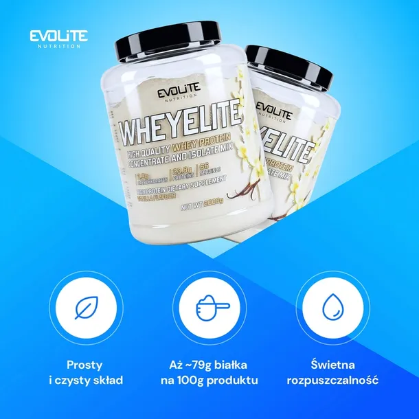 Evolite WheyElite jest połączeniem koncentratu białka serwatkowego oraz izolatu, bez zbędnych dodatków. Odżywka ta charakteryzuje się bardzo dobrą przyswajalnością, aminogramem, świetnym smakiem jak i znakomitą rozpuszczalnością.