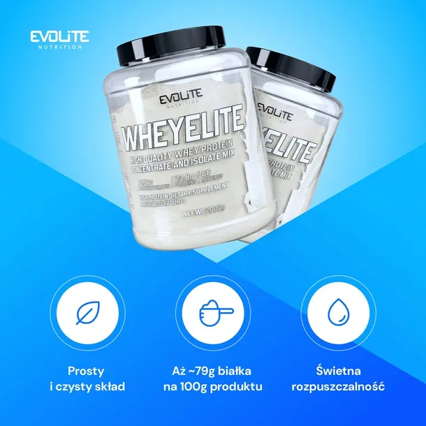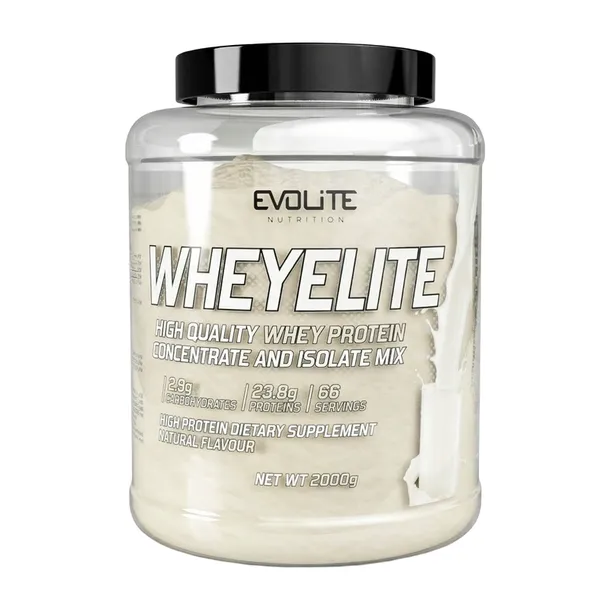 Evolite WheyElite jest połączeniem koncentratu białka serwatkowego oraz izolatu, bez zbędnych dodatków. Odżywka ta charakteryzuje się bardzo dobrą przyswajalnością, aminogramem, świetnym smakiem jak i znakomitą rozpuszczalnością.