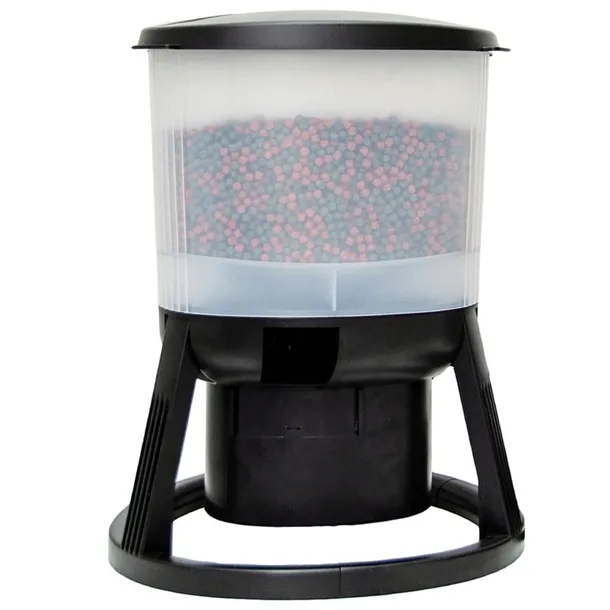 Automatyczny karmnik - wyrzutnia. Potrafi podać pokarm na odległość do 3m. Jest całkowicie wodoodporny i programowalny. Zasilany na akumulator, który podładujesz dzięki zasilaczowi z zestawu. Czas działania na pełnej baterii 180dni.