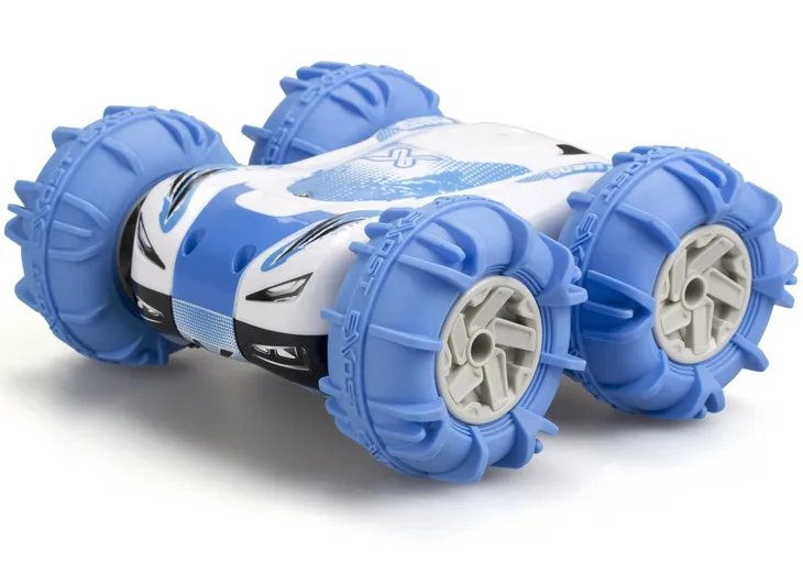 2,4 GHz, a steruje się nim za pomocą dołączonego do zestawu pilota. Samochód potrafi jeździć po wodzie oraz po lądzie, poruszając się przy tym we wszystkich kierunkach. Potężne opony ułatwiają mu pokonywanie niewielkich przeszkód, a przejeżdżając przez nie AquaCross obraca się o 360 stopni zmieniając swój wygląd! Wszystko za sprawą dwustronnego korpusu, którego górna i dolna część różnią się kolorem. Dzięki temu w jednej chwili możesz przekształcić auto w zupełnie nowy pojazd!