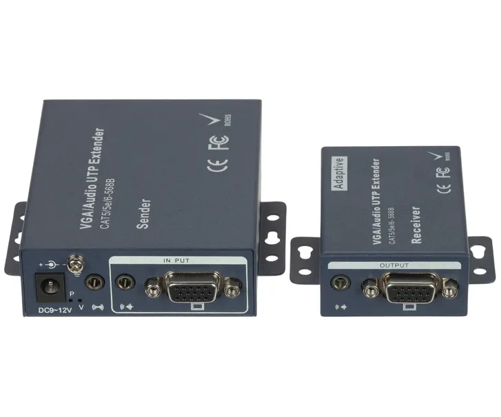 Zestaw nadajnika i odbiornika umożliwia transmisję sygnału VGA + 2 kanałów Audio (Stereo) na odległość do 50-140 m za pomocą skrętki UTP. Nadajnik dokonuje symetryzacji sygnału VGA umożliwiając jego transmisję po skrętce komputerowej. Trzy pary służą do transmisji składowych RGB, natomiast czwarta służy do transmisji synchronizacji. Nadajnik i odbiornik stanowią komplet i do prawidłowej pracy wymagane są oba urządzenia. W komplecie znajduje się nadajnik i odbiornik.