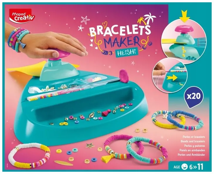 Fabryka bransoletek to doskonały pomysł na udaną zabawę. Sukces gwarantowany. Maszyna daje pewność, że nigdy nie zabraknie nam koralików do tworzenia pięknej biżuterii. Zestaw zawiera 8 kolorowych arkuszy wykonanych z EVA (tworzywo bezpieczne, lekkie, doskonale poddające się cięciu, a jednocześnie przyjemne w dotyku). Łącznie można z nich wykonać nawet 1700 płaskich, okrągłych koralików typu heishi. Takie koraliki zostały wymyślone przez Indian północnoamerykańskich, którzy wykonywali je z muszli, turkusu czy srebrnych rurek. Maszyna ułatwia nawlekanie wyprodukowanych koralików na żyłkę. W zestawie frędzelki, złote koraliki, separatory i ozdobne charmsy.