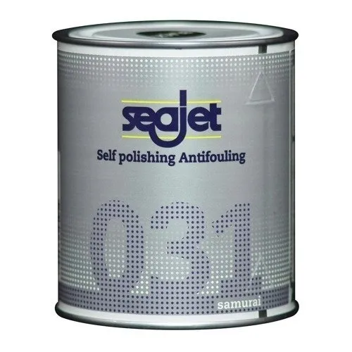 ANTIFOULING SEAJET 031 SAMURAI to samopolerująca farba przeciwporostowa na bazie tlenku miedzi. Nadaje się do wszystkich typów łodzi i jachtów do prędkości 40 węzłów. Nie zawiera związków cyny. Stosownie do swoich samopolerujących właściwości kontakt z wodą ma stale świeża powłoka biocydów, co zapewnia bardzo skuteczną ochronę przed porastaniem oraz zapobiega tworzeniu się grubej powłoki antifoulingu na kadłubie. Nadaje się do stosowania na wody słodkie i słone. Nadaje się na wszystkie kadłuby za wyjątkiem aluminiowych. Nałożenie dwóch warstw zaleca się w celu osiągnięcia skutecznej ochrony kadłuba. Farba musi wyschnąć przez min. 12 godziny przed wodowaniem. Czas do wodowania nieograniczony.