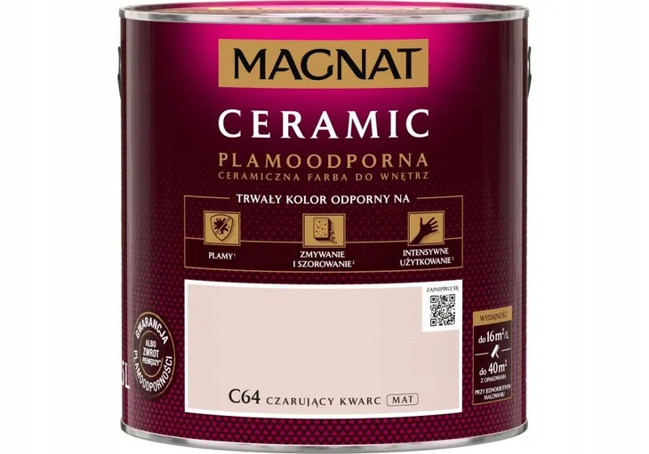 Emulsja Magnat Ceramic w kolorze czarujący kwarc to ceramiczna farba trzeciej generacji marki Śnieżka. Unikalna formuła emulsji Magnat daje jej ponadprzeciętne parametry odporności na wielokrotne zmywanie i szorowanie na mokro. Do czyszczenia można używać dezynfektantów, gdyż emulsja ta jest odporna na środki czyszczące. Powierzchnie pokryte tą farbą są plamoodporne, nie absorbują zabrudzeń i trudnych plam np. z wina, kawy, ketchupu, oleju, pisaków wodnych, kredek itp. Po nałożeniu na podłoże, farba zapewnia mu trwałe kolory i powłokę. Szczególnie polecana jest ona do dekoracyjno - ochronnego malowania ścian oraz sufitów wewnątrz pomieszczeń. Możną malować nią tynki cementowe, cementowo-wapienne, gipsowe, gipsowo-kartonowe, a także tapety z włókna szklanego. Przystosowana jest ona również do nakładania na powierzchnie drewniane, drewnopochodne i metalowe użytkowane wewnątrz pomieszczeń. Podczas malowania emulsja nie chlapie, malowanie nią jest łatwe i przyjemne, nie sprawia problemów nawet amatorom. Farba jest bardzo wydajna, 1 l wystarcza na pomalowanie 16 m2 powierzchni.