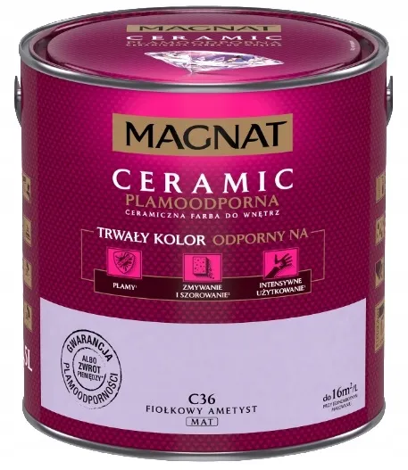 Emulsja Magnat Ceramic w kolorze fiołkowy ametyst to ceramiczna farba trzeciej generacji marki Śnieżka. Unikalna formuła emulsji Magnat daje jej ponadprzeciętne parametry odporności na wielokrotne zmywanie i szorowanie na mokro. Do czyszczenia można używać dezynfektantów, gdyż emulsja ta jest odporna na środki czyszczące. Powierzchnie pokryte tą farbą są plamoodporne, nie absorbują zabrudzeń i trudnych plam np. z wina, kawy, ketchupu, oleju, pisaków wodnych, kredek itp. Po nałożeniu na podłoże, farba zapewnia mu trwałe kolory i powłokę. Szczególnie polecana jest ona do dekoracyjno - ochronnego malowania ścian oraz sufitów wewnątrz pomieszczeń. Możną malować nią tynki cementowe, cementowo-wapienne, gipsowe, gipsowo-kartonowe, a także tapety z włókna szklanego. Przystosowana jest ona również do nakładania na powierzchnie drewniane, drewnopochodne i metalowe użytkowane wewnątrz pomieszczeń. Podczas malowania emulsja nie chlapie, malowanie nią jest łatwe i przyjemne, nie sprawia problemów nawet amatorom. Farba jest bardzo wydajna, 1 l wystarcza na pomalowanie 16 m2 powierzchni.