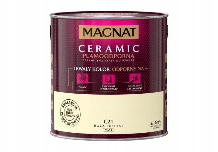 MAGNAT Ceramic to ceramiczna farba do wnętrz bazująca na ceramicznych komponentach oraz najwyższej jakości żywicach i pigmentach. Ta unikalna formuła zapewnia farbie MAGNAT ponadprzeciętne parametry odporności na szorowanie i wielokrotne zmywanie oraz sprawia, że powłoki farby nie absorbują zabrudzeń i „trudnych” plam oraz są odporne na środki dezynfekujące. Zapewnia to uzyskanie wyjątkowej trwałości powłoki i kolorów.