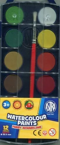Farby akwarelowe to farby wodne służące do malowania na papierze. Mają one postać suchych guziczków, z których po zwilżeniu wodą niemal natychmiast uzyskuje się gotowe do użycia farby. Akwarele szkolne ASTRY składają się z wysokiej jakości drobno roztartych pigmentów, połączonych rozpuszczalnym w wodzie spoiwem. Oprócz pigmentów i spoiw akwarele szkolne zawierają pewne ilości wypełniaczy, które sprawiają, że farba wysychając matowieje. Dzięki temu nakładając farbę grubiej można malować technikami zbliżonymi do gwaszu, a w większych rozcieńczeniach technikami charakterystycznymi dla akwareli. Akwarele można wykorzystywać w technikach łączenia z farbami temperowymi, plakatowymi i kredkami woskowymi ASTRY. Akwarele ASTRY przeznaczone są głównie dla dzieci i młodzieży szkolnej rozpoczynającej edukację plastyczną. Dzięki swej postaci mogą być łatwo przenoszone np. w uczniowskich tornistrach oraz przechowywane przez długi czas bez obawy zmiany właściwości.