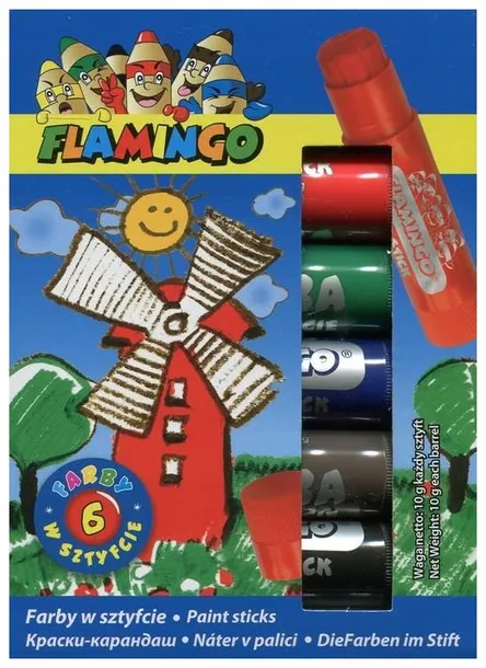 Łatwospieralne, szybkoschnące farby w sztyfcie. Idealne do rysowania i malowania na papierze, kartonie lub drewnie. Gotowe do użycia - nie wymagają stosowania wody i pędzli. Plastikowa oprawa chroni dłonie przed pobrudzeniem. Pozwalają zachować czystość w miejscu zabawy i pracy. Miękkie i łatwe w aplikacji, gwarantują dokładne krycie malowanych powierzchni. Po wyschnięciu farby nie blakną i zachowują jaskrawe barwy. Bezwonne, bardzo wygodne i praktyczne. W zestawie 6 intensywnych kolorów po 10 g każdy.