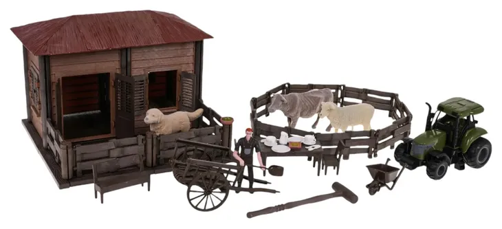 Zestaw farma, domek rolnika z traktorem i akcesoriami dla dzieci od 3-go roku życia. Zestaw wykonany został z najlepszej jakości materiałów i zawiera wszystko, co niezbędne na farmie. Duży domek rolnika w środku posiada łóżko. Przed domkiem znajduje się ławeczka oraz zagroda na bydło. W zagrodzie jest krówka i owieczka. Nie mogło zabraknąć również pieska, który pilnuje farmy oraz najważniejszej osoby na farmie, czyli rolnika. Zestaw zawiera także traktor, wózek ręczny, narzędzia rolnicze: łopata, widły, grabie oraz taczki. Zestaw zasilany jest bateriami typu 3 x AG13 (w zestawie). Krówka, owieczka i piesek wydają odgłosy charakterystyczne dla tych zwierzątek.