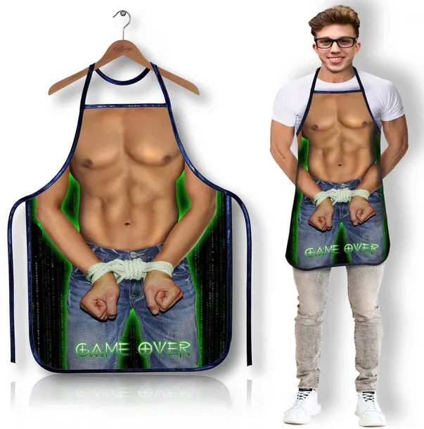 Zabawny fartuszek kuchenny „Game Over” to idealny prezent dla mężczyzn z poczuciem humoru. Wykonany z wysokiej jakości materiału, jest trwały, lekki i łatwy w utrzymaniu czystości. Nadruk przedstawia umięśnione męskie ciało w jeansach, z rękami związanymi liną i napisem „Game Over”, co nadaje mu żartobliwego i oryginalnego charakteru. Świetny pomysł na prezent dla partnera, na wieczór kawalerski lub zabawną imprezę. Doda kuchennym obowiązkom nuty humoru i nieco pikantnej zabawy! Styl: „Game Over”