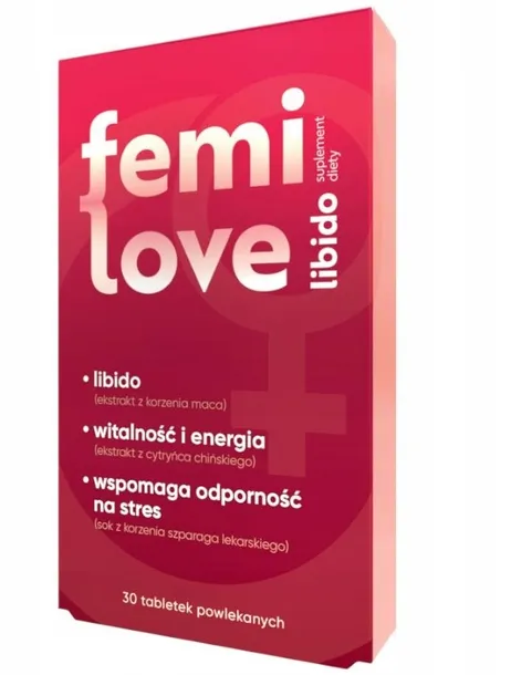 Femilove Libido to suplement diety w postaci tabletek powlekanych, który w swoim składzie zawiera witaminę E, selen, L-argininę oraz ekstrakty roślinne. Preparat przeznaczony jest dla osób dorosłych.
