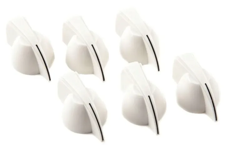 Zestaw sześciu białych pokręteł sterujących wzmacniaczem w stylu „głowy kurczaka”.