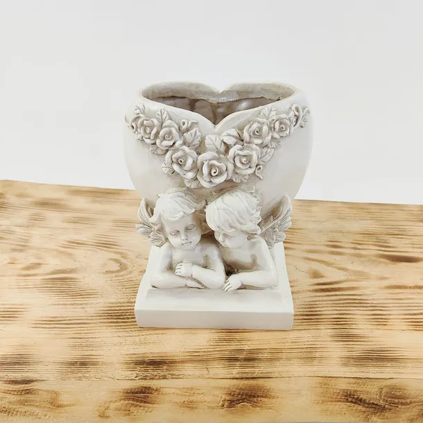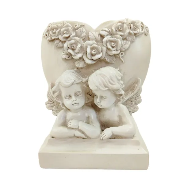 Dwa aniołki siedziące na podstawie osłonki w kształcie serca z aplikacją różyczek, w kolorze złamanej bieli z delikatną patyną.