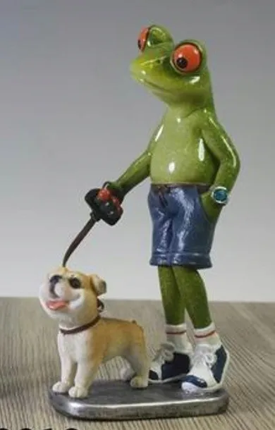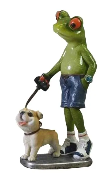 Figurka ta ukazuje uroczą scenę, gdzie żaba i pies idą razem na spacerze. Figurka może być używana jako ozdoba wnętrza lub dekoracyjny element ogrodu.