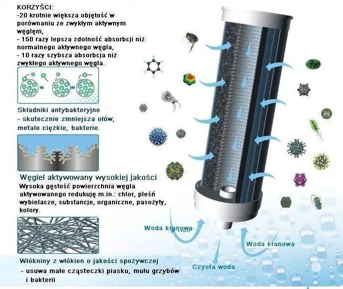 Filtr ma także znakomite właściwości pozwalające na absorbcję wszelkich zanieczyszczeń chemicznych; przede wszystkim – co jest od razu wyczuwalne – ogranicza chlorowanie wody.