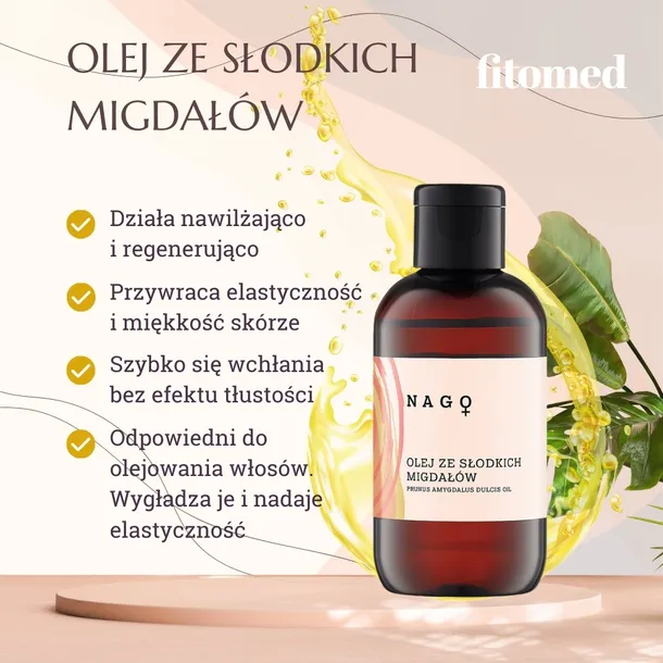 - Lekki i nietłusty. Olej migdałowy, nałożony cienką warstwą, szybko się wchłania, pozostawiając skórę miękką, bez efektu tłustości, co sprawia, że jest idealny do codziennego stosowania.