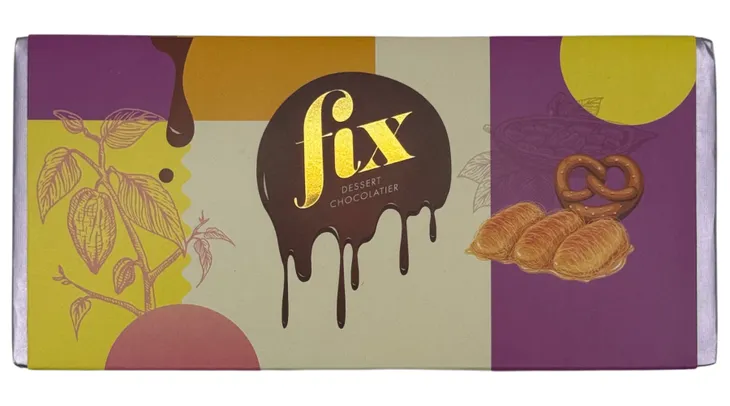 FIX DUBAI CHOCOLATE z jedynego miejsca sprzedającego oryginalny produkt - FIX Dessert Chocolatier - o smaku Pick Up A Pretzel - chrupiąca knafeh i słony karmelowy precel, oblana mleczną czekoladą.