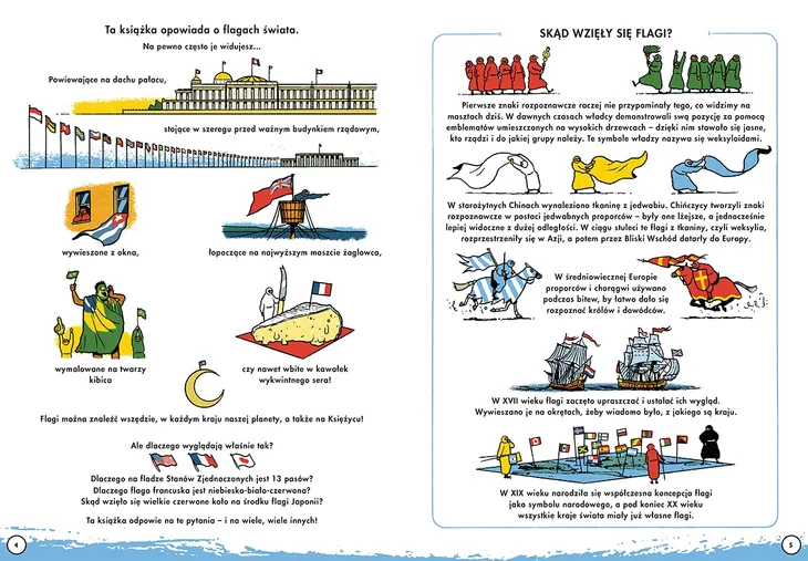Lektura obowiązkowa dla wszystkich flagomaniaków! Dlaczego na fladze Stanów Zjednoczonych jest 13 pasów? Co symbolizuje wielkie czerwone koło na środku flagi Japonii? Jak wyglądały herby i bandery dawnych królestw? Który kraj ma na fladze papugę, a który parasol? Czy flaga może być kwadratowa, trójkątna albo w ząbki? Słońca, gwiazdy, krzyże, lwy, orły i smoki – barwny świat flag może przyprawić o zawrót głowy. Skąd się wzięły i co oznaczają ich kolory i widoczne na nich symbole? Dzięki temu przewodnikowi poznacie wszystkie ich tajemnice. Są tu flagi współczesne i chorągwie dawnych imperiów, flagi dobrze znane i te z dalekich krajów, a nawet spoza naszej planety! A każda z nich skrywa w sobie fascynującą opowieść o dziejach i ambicjach kraju, którego jest znakiem. Pora na wyprawę w tysiąc flag dookoła świata!