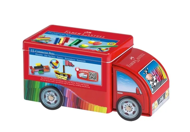 atrament na bazie wody i barwników naturalnychintensywne koloryspieralne z większości standardowych tkanindzięki specjalnym klipsom pisaki można ze sobą łączyć w kreatywne konstrukcjepisaki w atrakcyjnym, metalowym pudełku w kształcie autka towarowego33 kolory