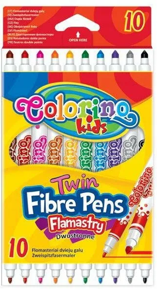 Dwustronne flamastry w 10 kolorach. Dwie końcówki flamastra przeznaczone do różnych zadań: stożkowa końcówka pozwala rysować linie o dwóch grubościach: 1 lub 4 mm, cienka końcówka o grubości 0,7 mm świetnie nadaje się do pisania lub rysowania precyzyjnych kształtów. Flamastry umieszczone są w plastikowej podstawce ułatwiającej przechowywanie.