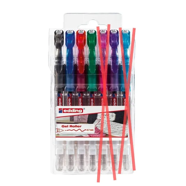 Zestaw zawiera 7 długopisów żelowych – czarny, czerwony, niebieski, zielony, fioletowy, różowy i jasnoniebieski