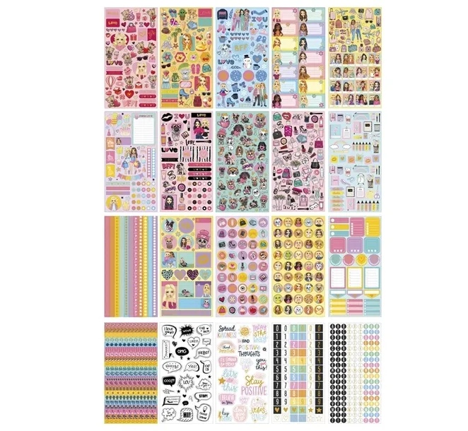 - Tematyka: Lato, odzież, wakacje, walentynki, naklejki na zeszyt, alfabet