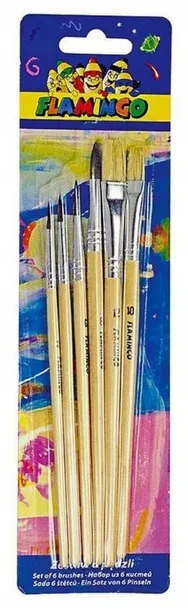 Zestaw 6 pędzli z naturalnym włosiem. Wytrzymałe drewniane uchwyty z oznaczeniem grubości. Pędzle sprawdzą się idealnie zarówno na zajęciach malowania farbami w szkole, jak i w domu. Zestaw zawiera 6 pędzli: 2 płaskie i 4 okrągłe. Pędzle okrągłe o grubościach: 2 mm, 4 mm, 6 mm i 8 mm. Pędzle płaskie o grubościach: 10 mm i 12 mm. Pakowane na blistrze. Zestaw zawiera 6 pędzli: 4 płaskie i 2 okrągłe.
