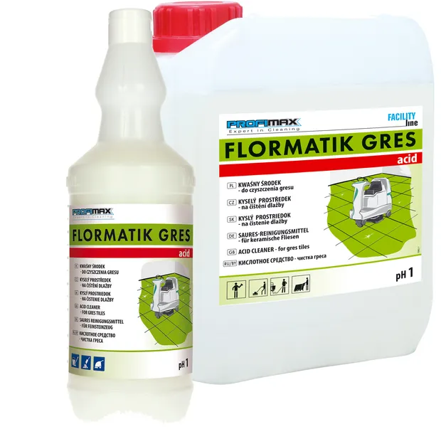 Kwaśny środek FLORMATIK GRES ACID 1L to skuteczne rozwiązanie do czyszczenia gresu o mikroporowatej strukturze. Dzięki kwasowi fosforowemu o kwaśnym pH doskonale usuwa naloty wapienne, rdzę oraz resztki cementu. Może być stosowany zarówno ręcznie, jak i w automatach myjących oraz szorowarkach jednotarczowych. Zalecamy stosowanie naprzemiennie z zasadowym FLORMATIK GRES ALKALI, aby uzyskać doskonały efekt czyszczący.