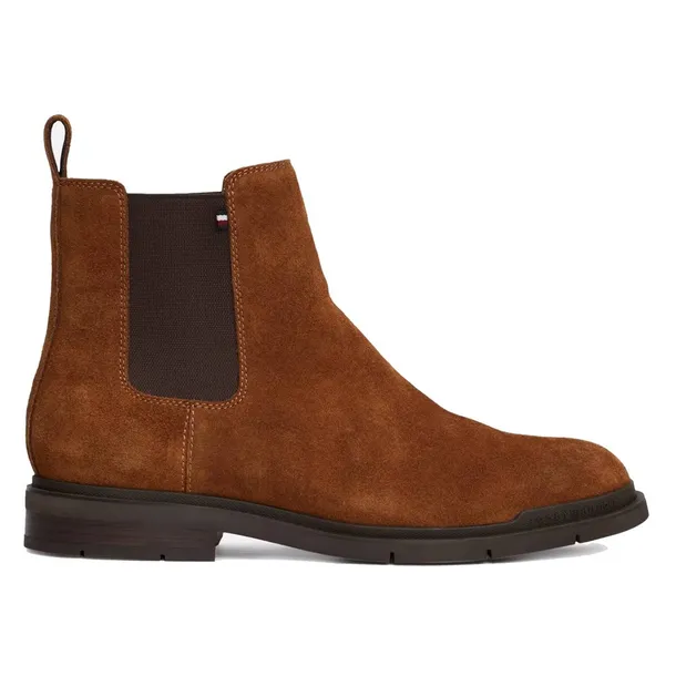 Brązowe sztyblety męskie Tommy Hilfiger wykonane z wysokiej jakości zamszu. Klasyczny fason z elastycznymi wstawkami po bokach ułatwia zakładanie i zapewnia wygodne dopasowanie. Ciemna podeszwa z delikatnym bieżnikiem gwarantuje komfort i stabilność. Stylowy, ponadczasowy model idealny zarówno do casualowych, jak i eleganckich stylizacji.