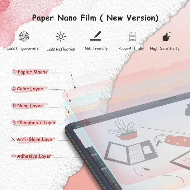 Folia Paper Screen Protector BERSEM nowej generacji została stworzona z myślą o pisaniu, rysowaniu i pracy kreatywnej na iPadzie. Zastosowanie ulepszonej technologii Paper Nano zapewnia realistyczne odczucie papieru, większą kontrolę nad rysikiem oraz komfort pracy bez odblasków. To idealny wybór dla studentów, grafików i wszystkich osób korzystających z Apple Pencil.