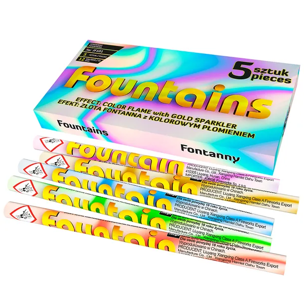 Efekt: Złota fontanna z żółtym płomieniem złota fontanna z niebieskim płomieniem złota fontanna z fioletowym płomieniem złota fontanna z zielonym płomieniem złota fontanna z czerwonym płomieniem
