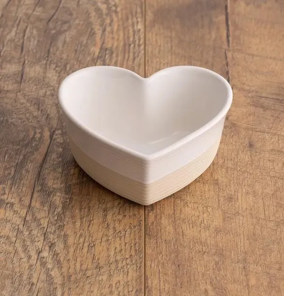 Naczynia mają żebrowane ścianki i kolor beżowo-kremowy. Na każdym produkcie znajdziesz też kształt małego serduszka.