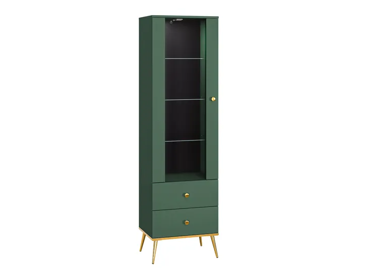 Luksusowe meble, pełne elegancji oraz połysku rozjaśnią wnętrze nowoczesnego salonu jak i jadalni. Skośne stożkowe nóżki w kolorze błyszczącego złota, idealnie komponują się z wieńcem dolnym wykończonym w tym samym odcieniu złota. Delikatne złote uchwyty stanowią dopełnienie tej pełnej kunsztu oraz szyku kolekcji.