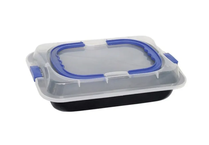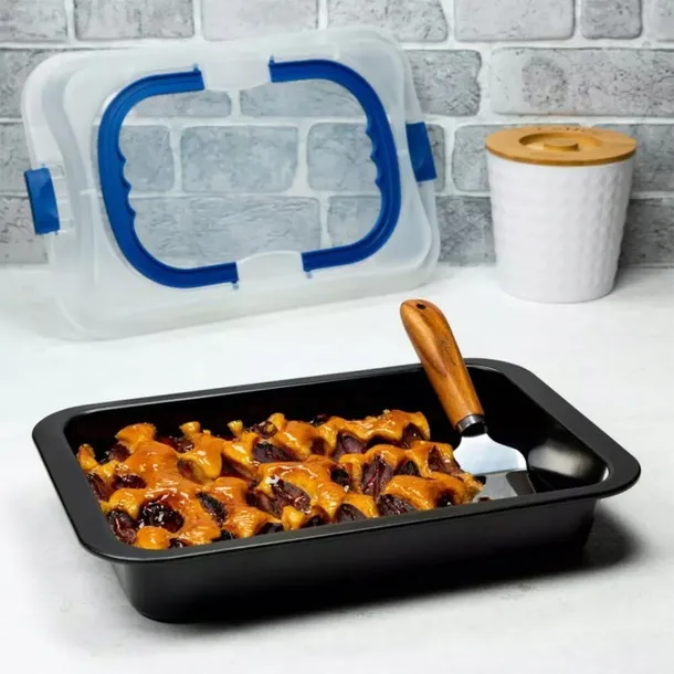 Wysokiej jakości forma do pieczenia wyposażona w praktyczną przykrywkę z rączkami, zamykana na zatrzaski.