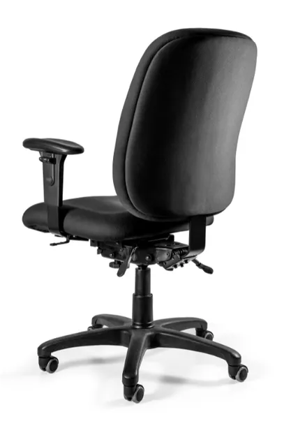 Fotel biurowy LIDER to fotel do zadań specjalnych, gdyż spełnia normy BS 5459-2:2000 dotyczące foteli biurowych dla użytkowania przez ludzi o masie do 150 kg oraz dla użytkowania do 24 godzin dziennie. Ten fotel do komputera tapicerowany jest czarną tkaniną materiałową o dużej odporności na ścieranie wynoszącej 110 000 cykli Martindale'a. Fotel jest odpowiednio wyprofilowany zapewniając doskonałe podparcie dla całego ciała. Fotel wyposażony jest w mechanizm asynchroniczny umożliwiający niezależną regulację oparcia od siedziska lub swobodne odchylanie oparcia wraz z siedziskiem. Dodatkowo możliwa jest regulacja wysokości oraz głębokości siedziska. Oparcie fotela i siedziska można pochylić do przodu lub do tyłu. W fotelu biurowym LIDER zastosowano podłokietniki 2D, które zrobione zostały z tworzywa sztucznego i mają miękkie nakładki z poliuretanu. Podstawa krzyżowa fotela do biura skonstruowana jest z czarnego tworzywa sztucznego i zaopatrzona w zestaw miękkich kółek pozwalających na przesuwanie fotela po panelach oraz płytkach.