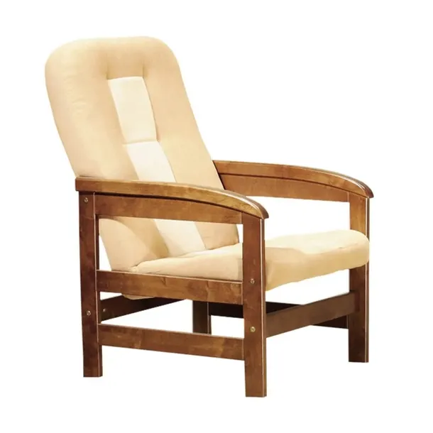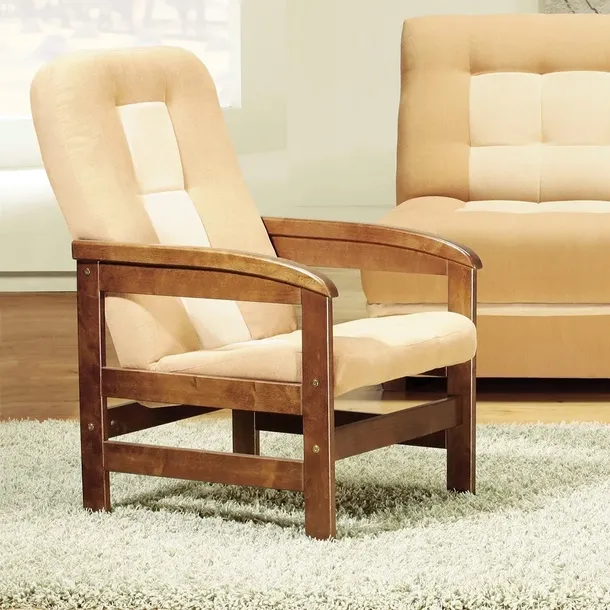 Osadzony na drewnianym stelażu, posiada proste nóżki i lekko wyprofilowane podłokietniki wykonane z litego drewna , do wyboru w wielu wybarwieniach kolorystycznych.