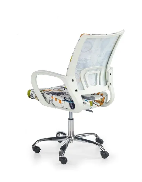 Fotel obrotowy dla dzieci i młodzieży, obszyty tkaniną z wzorem wielokolorowym. Płynna regulacja wysokości fotela za pomocą siłownika gazowego pozwala dostosować jego wysokość do wzrostu osoby użytkującej.