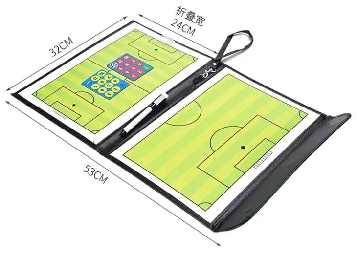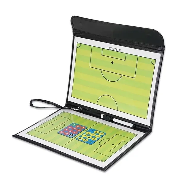Tablica taktyczna służąca do prowadzenia treningów w piłkę nożną. Wygodna forma w kształcie zamykanego na rzep folderu z ekoskóry. Wyposażona w dwie magnetyczne tablice przedstawiające pole gry. W komplecie znajdują się również ścieralny pisak oraz 24 magnesy. Tablica została wykonana z wodoodpornego materiału, co pozwala na prowadzenie treningów nawet w trudnych warunkach atmosferycznych. Dodatkowa zawieszka umożliwiają odwieszenie folderu na haczyk.