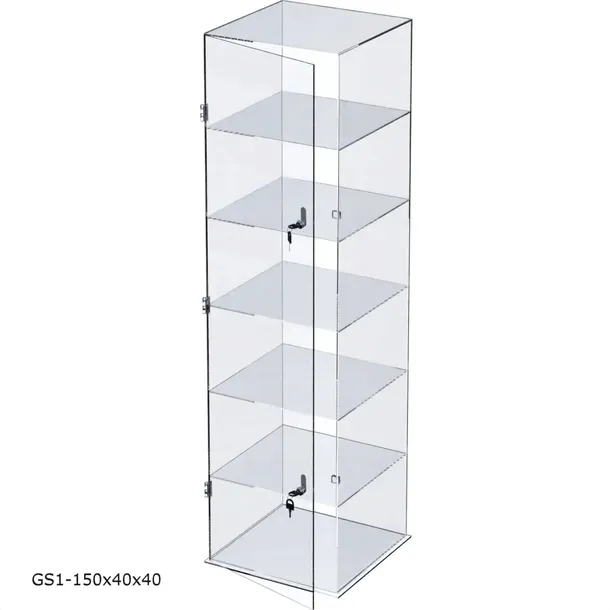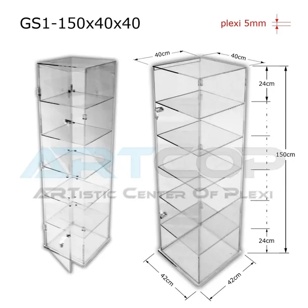 Gablota z plexi wolnostojąca o wym. 150cm x 40cm x 40cm z 6 półkami wewnętrznymi.