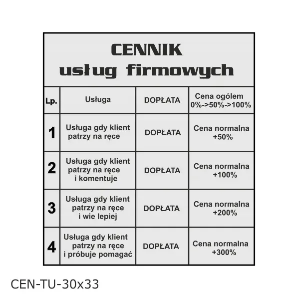Tabliczka rozwesela klientów i rozluźnia atmosferę w zakładzie. Fajny gadżet w każdym zakładzie usługowym lub produkcyjno-usługowym.