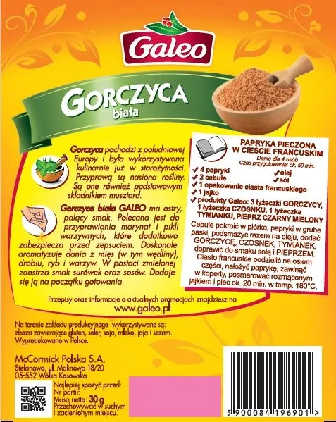 Galeo Gorczyca biała Gorczyca biała Galeo ma ostry, palący smak. Polecana jest do przyprawiania marynat i pikli warzywnych, które dodatkowo zabezpiecza przed zepsuciem. Doskonale aromatyzuje dania z mięs (w tym wędliny), drobiu, ryb i warzyw. W postaci zmielonej zaostrza smak surówek oraz sosów. Dodaje się ją na początku gotowania.