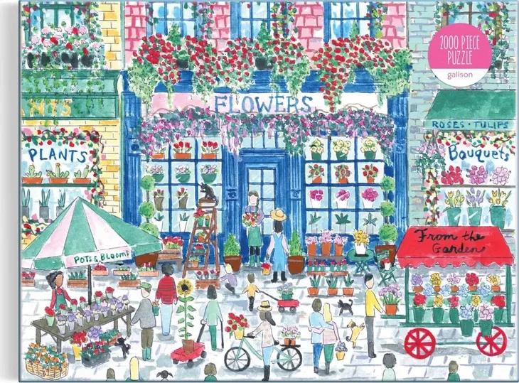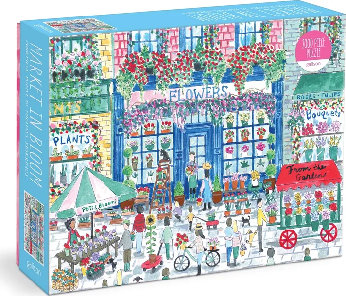 Puzzle Market in Bloom przenoszą Cię na tętniący życiem kwiatowy targ w samym sercu miasta. Michael Storrings, znany ilustrator i dyrektor artystyczny, uchwycił w tej scenie pełnię kolorów, zapachów i emocji, jakie niesie wiosenny dzień wśród straganów, bukietów i miejskiego gwaru.