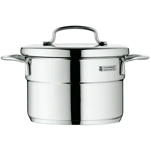Garnek wykonany jest z polerowanej stali nierdzewnej Cromargan® i ma uniwersalne dno TransTherm®. Nadaje się na wszystkie rodzaje kuchenek, również do indukcji. Wyposażony w ściśle przylegającą pokrywkę.