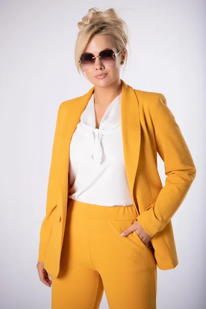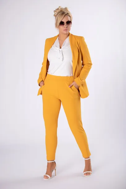 Zestaw składający się z niezapinanego żakietu o klasycznym fasonie i spodni o prostych nogawkach z gumą w pasie. Komplet uszyty został z przyjemnego, miękkiego w dotyku materiału. Garnitur spodoba się miłośniczkom sportowej elegancji. Można go wykorzystać w wielu stylizacjach, począwszy od codziennej po elegancką. Model dostępny w kilku wariantach kolorystycznych.
