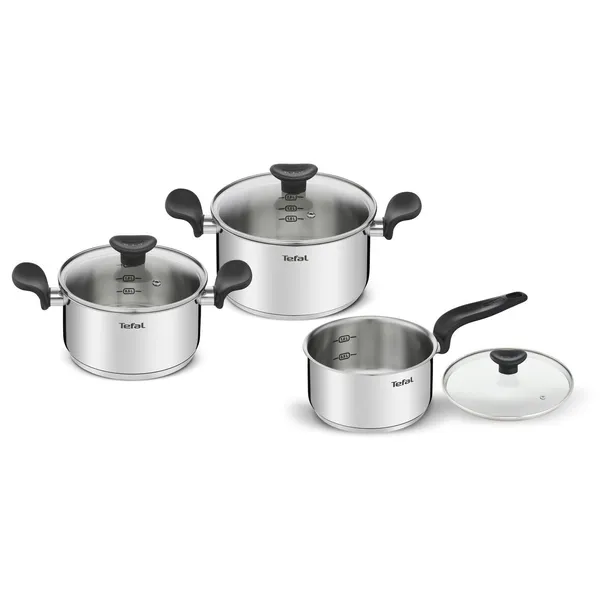 Zestaw garnków Tefal Primary to komplet zaprojektowany, by zapewnić wszechstronność i trwałość podczas przygotowywania potraw, składający się z trzech elementów z odpowiadającymi pokrywkami o rozmiarach 16, 18 i 20 cm. Wykonany głównie ze stali nierdzewnej, gwarantuje odporność na korozję oraz równomierne rozprowadzanie ciepła, co ułatwia efektywne i równomierne gotowanie. Dołączone pokrywki pozwalają lepiej zatrzymać ciepło i kontrolować proces gotowania, zwiększając wygodę użytkowania. Zintegrowane uchwyty pokryte są czarną bakelitową powłoką, materiałem zapewniającym pewny chwyt i ochronę przed wysoką temperaturą, co podnosi bezpieczeństwo i komfort pracy. Dodatkowo design łączy odcienie czerni i srebra, nadając nowoczesny i elegancki wygląd, pasujący do każdej kuchni. Zestaw jest odporny na mycie w zmywarce, co ułatwia codzienne czyszczenie i konserwację, zmniejszając wysiłek po użyciu. Zestaw Tefal Primary to praktyczne rozwiązanie dla osób poszukujących trwałych i funkcjonalnych naczyń, idealnych do różnych technik kulinarnych i codziennego użytku. W sumie stanowi zrównoważoną opcję łączącą solidne materiały i cechy zapewniające wygodę oraz długotrwałe użytkowanie w kuchni.
