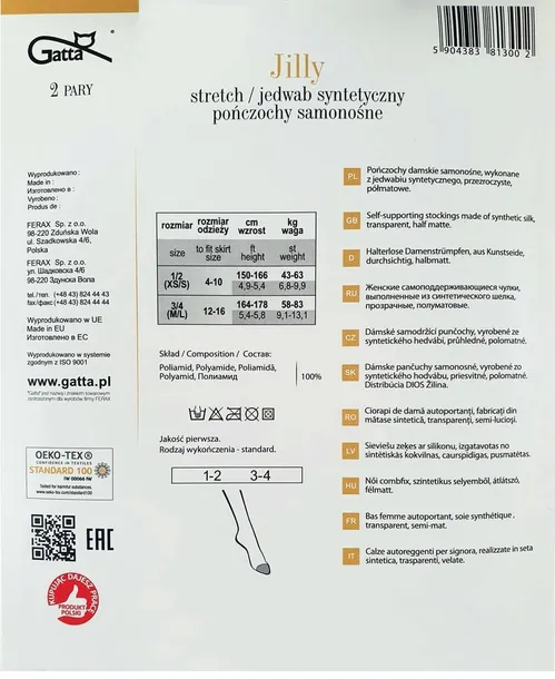 Klasyczne, gładkie i bardzo kobiecie pończochy samonośne. Transparentne, półmatowe, wykonane z przędzy typu Stretch, dzięki czemu doskonale przylegają do ciała, nie marszczą się i świetnie wyglądają. W górnej części wykończone nieuciskającą, silikonową gumokoronką z eleganckim, prostym wzorem w paski, zapewnia to utrzymanie pończoch na miejscu i podkreśla ich zmysłowy charakter. Brak wyraźnie zaznaczonej w części palcowej sprawia, że pasują również do otwartego obuwia. Idealne na wiosnę i lato. W opakowaniu znajdują się dwie pary. Skład: 100% poliamid.