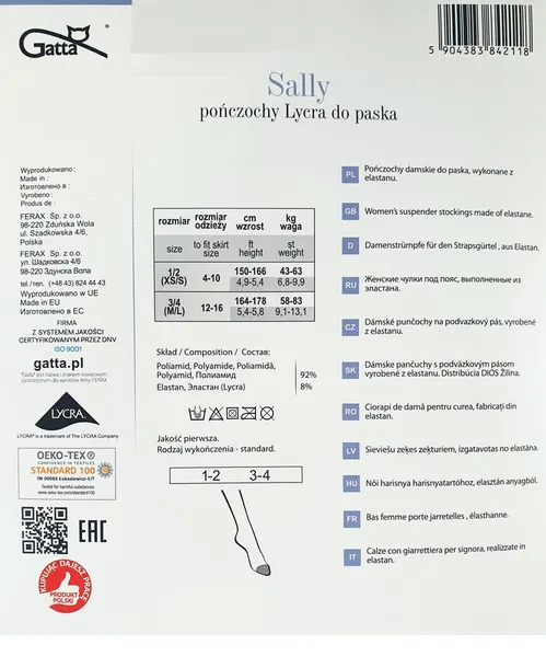 Klasyczne, gładkie pończochy damskie do paska. Zakończone w górnej części szerokim wzmocnieniem zabezpieczającym je przed uszkodzeniem przez zapinki przy pasie. Transparentne, matowe, wykonane z poliamidu z dodatkiem włókna LYCRA. Bardzo elastyczne, idealnie przylegają do ciała. Brak zaznaczonej części palcowej sprawia, że pasują również do odkrytych butów. Idealne na wiosnę i lato. Grubość: 15 DEN. Skład: 92% poliamid, 8% elastan.