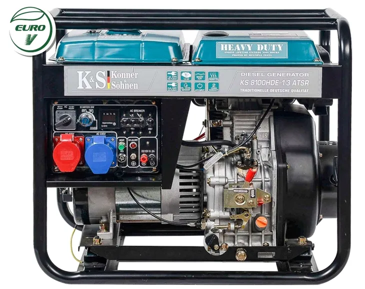 Generator prądu Konner & Sohnen KS 8100 HDE-1/3 ATSR to urządzenie stosunkowo niewielkie i lekkie. Znamionowa moc wytwarzanej energii wynosi 6,0 kW / 7,5 kVA, z kolei moc maksymalna to 6,5 kW / 8,13 kVA. Agregat zasilany jest przez firmowy silnik wysokoprężny z elektrycznym rozrusznikiem o mocy 14,0 KM, który przeszedł wielogodzinne oraz wielopoziomowe testy. Silnik ten jest urządzeniem bardzo wytrzymałym i oszczędnym, co pozwala na długi czas eksploatacji. Agregat ma opcję podłączenia systemu ATS, dzięki któremu w przypadku awarii lub niepoprawnego działania podstawowej sieci energetycznej utrzymywana jest ciągłość zasilania. Dzięki wzmocnionej stalowej ramie, która chroni generator przed uszkodzeniem podczas użytkowania, urządzenie doskonale się sprawdza w ciężkich warunkach eksploatacyjnych. KS 8100 HDE-1/3 ATSR wyposażono w stalowy zbiornik paliwa o pojemności 11 litrów, który (przy ~50% obciążenia) pozwala na 6,9 godzin pracy bez tankowania. Agregat ma jedno gniazdo 32 A / 230 V, jedno 16 A / 400 V oraz jedno gniazdo prądu stałego 12 V.