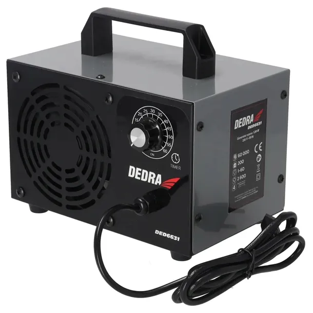 Profesjonalny ozonator DEDRA DED6631 to urządzenie, które generuje ozon (O₃) i stosowany jest do dezynfekcji powietrza, usuwania zapachów oraz eliminacji alergenów. Skutecznie niszczy bakterie, wirusy, pleśnie i inne patogeny obecne w powietrzu, neutralizuje nieprzyjemne zapachy dymu papierosowego, pleśni, wilgoci oraz pomaga usuwać kurz, roztocza oraz pyłki. Pomoże również przy odgrzybianiu ścian i klimatyzacji.